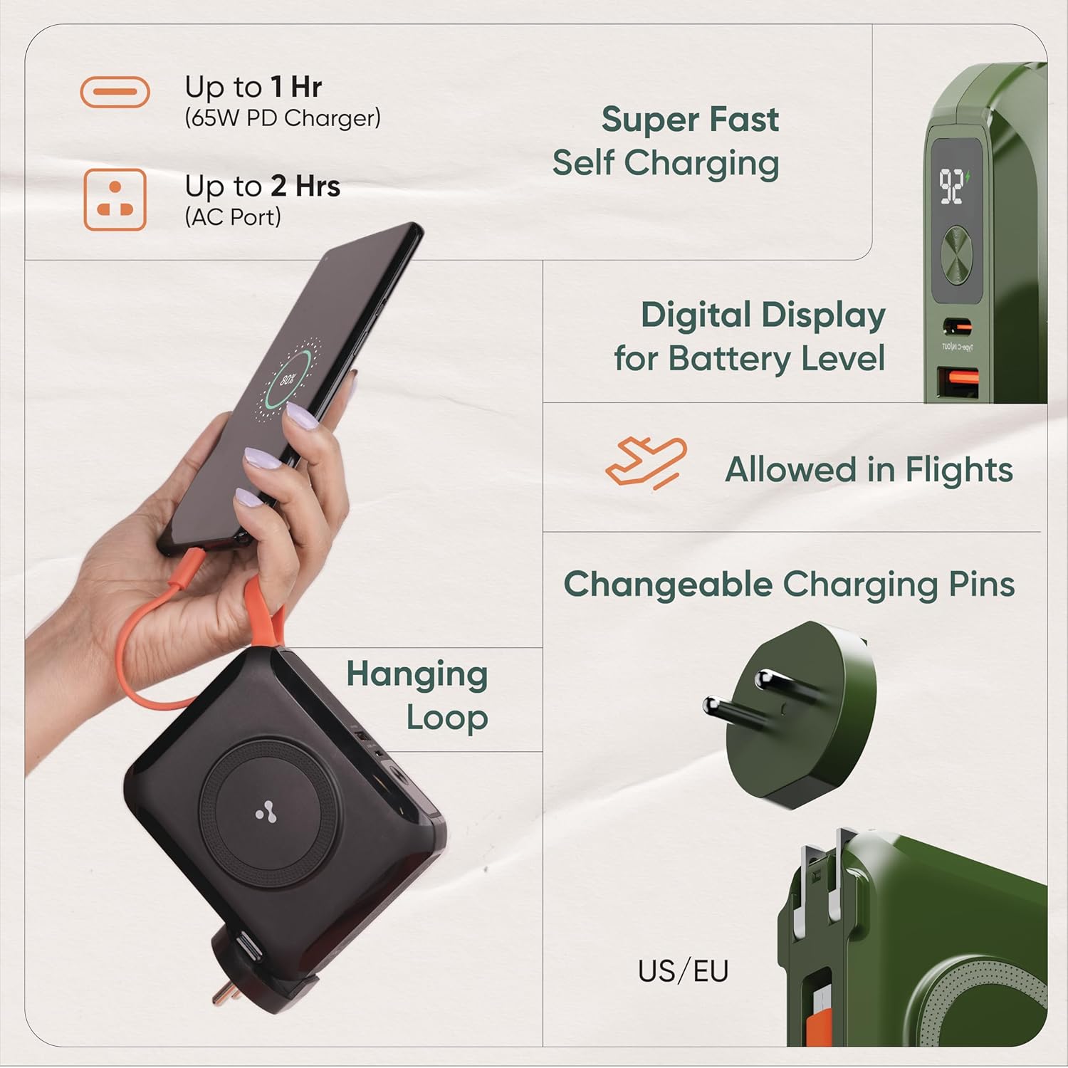 4-in-1 Charging DeviceThe AeroSync 65 combines a powerbank, MagSafe and wireless charging, a wall charger, and an inbuilt Type-C cable in one device. This all-in-one solution simplifies your charging needs, whether you’re at home or on the go. |