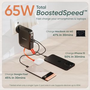Enjoy rapid charging with 65W Total BoostedSpeed, powering your devices quickly and efficiently. Charge your iPhone 15 to 50%, OnePlus 10 Pro to 45%, and MacBook Air M2 to 47% in just 30 minutes.