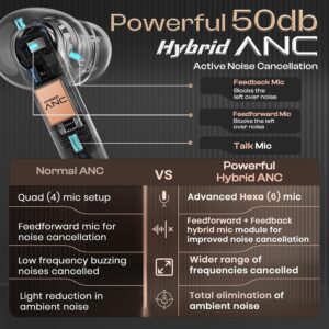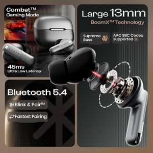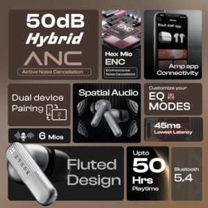 Fit and finish, 6 Mic Hybrid ANC, Bluetooth 5.4, Spatial Audio, 50H Playtime, Hex Mic ENC, App Connectivity, 13mm Bass Drivers, Dual Device Pairing, Touch Controls, Multipoint Pairing |