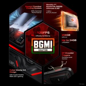 The GT 30 Pro 5G+ is a feature-rich gaming smartphone designed for high-performance and immersive experiences. Officially certified by Krafton for 120 FPS BGMI gameplay, it delivers ultra-smooth visuals with faster touch response and reduced motion blur. Powered by the MediaTek Dimensity 8350 ULTIMATE processor with HyperEngine Adaptive Gaming Technology, it ensures blazing-fast performance and efficient multitasking. Console-style GT Shoulder Triggers enhance control while keeping the display clear, and the Cyber Mecha 2.0 design with customizable LED lights offers two striking styles—Dark Flare and Blade White—catering to different gamer aesthetics. XBoost AI with Esports Mode blocks distractions and boosts CPU, network, and system performance, while Network Enhancement and Performance Modes ensure uninterrupted gameplay. A vivid 1.5K 144 Hz AMOLED display with 4500 nits peak brightness offers crystal-clear visuals, complemented by UFS 4.0 + LPDDR5X memory for ultra-fast data speeds. The advanced Vapor Chamber Cooling System keeps temperatures in check during intense sessions, while a 5500 mAh battery with bypass charging and 45W fast charging ensures long-lasting power. Immersive haptic feedback adds realism, and the clean, customizable XOS 15 interface powered by Infinix AI enhances overall usability and personalization.