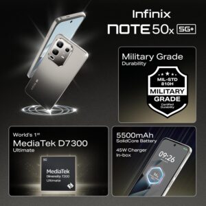 The NOTE 50x 5G+ is MIL-STD-810H certified and IP64 rated for ultimate durability; so your phone can handle drops, dust, water, and extreme temperatures with ease. Stay worry-free in any adventure, whether you’re hiking, traveling, or just tackling daily mishaps!