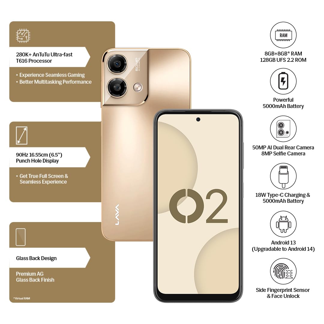 Lava O2 (Royal Gold, 8GB RAM, UFS 2.2 128GB Storage)