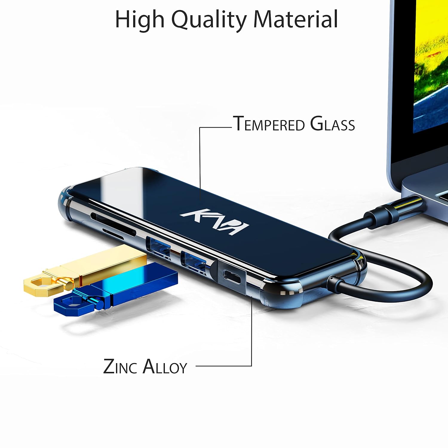 Built with plated Zinc casing and glass on top . This usb c to hdmi adapter is more corrosion-resistant, better heat insulated The glass panel dissipates heat faster and better protects the hub and laptop.