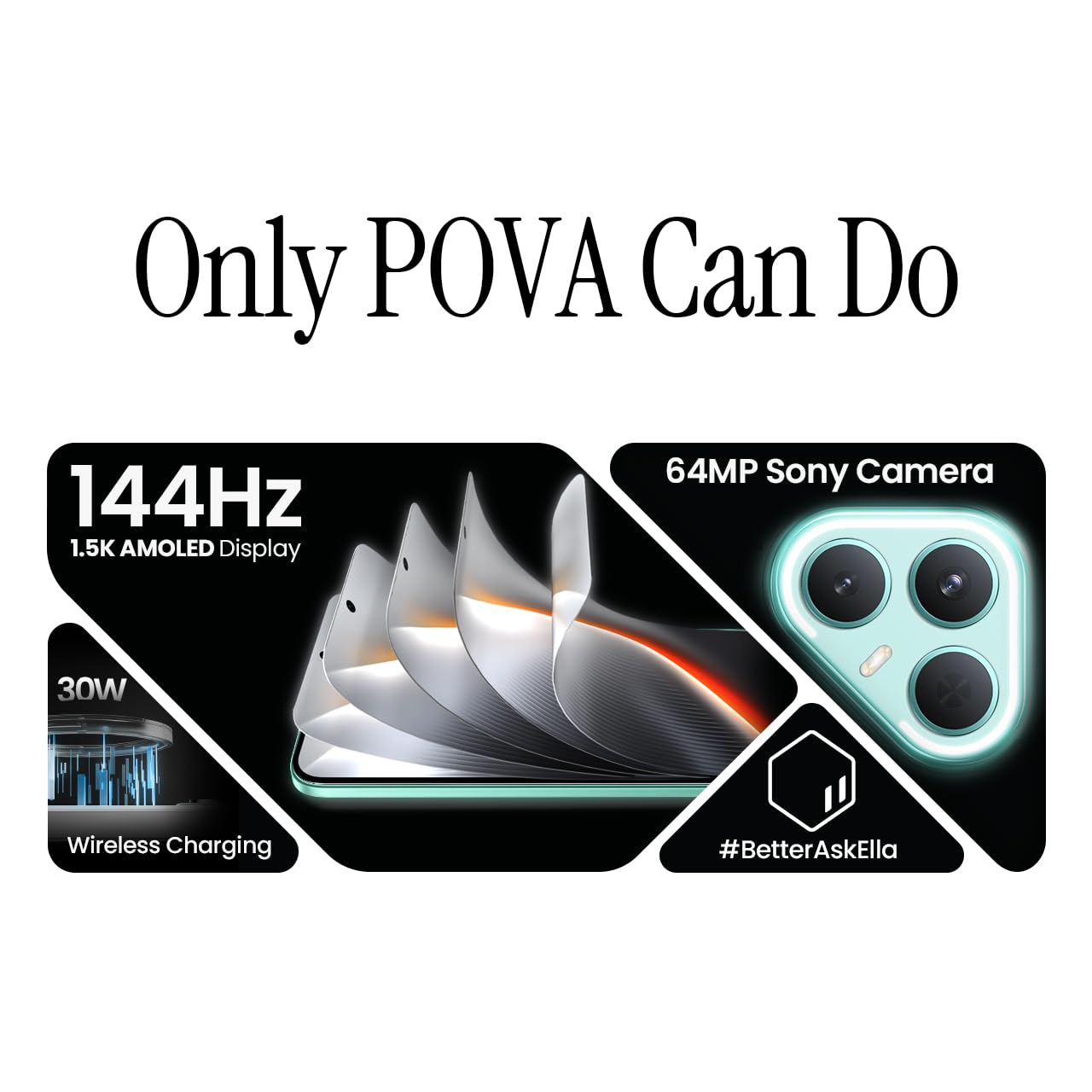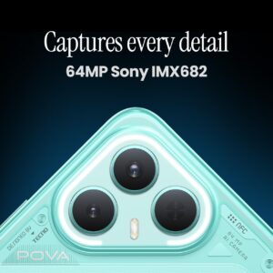 The POVA 7 Pro is crafted to stand out, with a bold, futuristic design and the segment’s first Multi-Functional Delta Light Interface that reacts to calls, music, and gameplay. Its sleek form is not just stylish but expressive, making a statement wherever you go. Up front, it boasts a 144Hz 1.5K AMOLED display with 4500 peak brightness, delivering ultra-smooth, sharp, and vibrant visuals even under direct sunlight. On the inside, Ella AI with Indian Language Support* leads the way, making the POVA 7 Series smarter, more intuitive, and deeply personal. It’s powered by next-gen AI built for Productivity, Fun, and Safety, with smart features like call screening, image enhancement, and fraud alerts, helping you do more, enjoy more, and stay secure. Powered by the D7300 Ultimate 5G processor, it packs up to 16GB* RAM with Memory Fusion and 256GB ROM. It also brings the segment’s first 6000mAh battery with 30W wireless charging, along with 45W wired charging, a 64MP Sony camera*, dual stereo speakers with Dolby Atmos, IR Blaster, and seamless connectivity with 4×4 MIMO and the Intelligent Signal Hub.