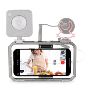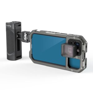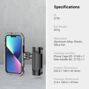 SmallRig handheld Kit for iPhone 13 3735 is a perfect mobile phone video rig for vlogging, mobile filmmaking, commercials, etc. The kit comes with a cage specially designed for iPhone 13 and a side handle for a more stable handheld phone shooting. The cage features 1/4″-20 anti-twist threaded holes and cold shoes that support accessories as Tripod BUT2429, Microphone 3452 and LED Light 3286, etc. It supports M-mount lens to upgraded the video quality. It gives access to iPhone buttons, ports, and ultra-wide angle lens thanks to its hollow design. The metal full cage with built-in shims prevents scratches, reduces vibration. The cage enables horizontal and vertical shooting.