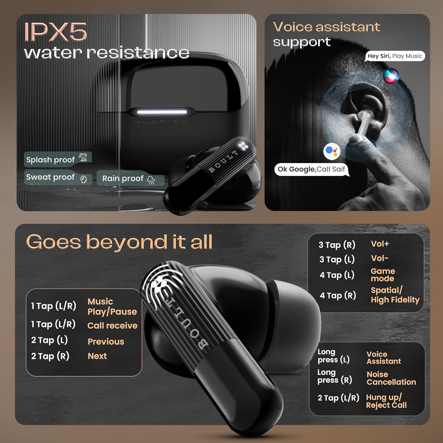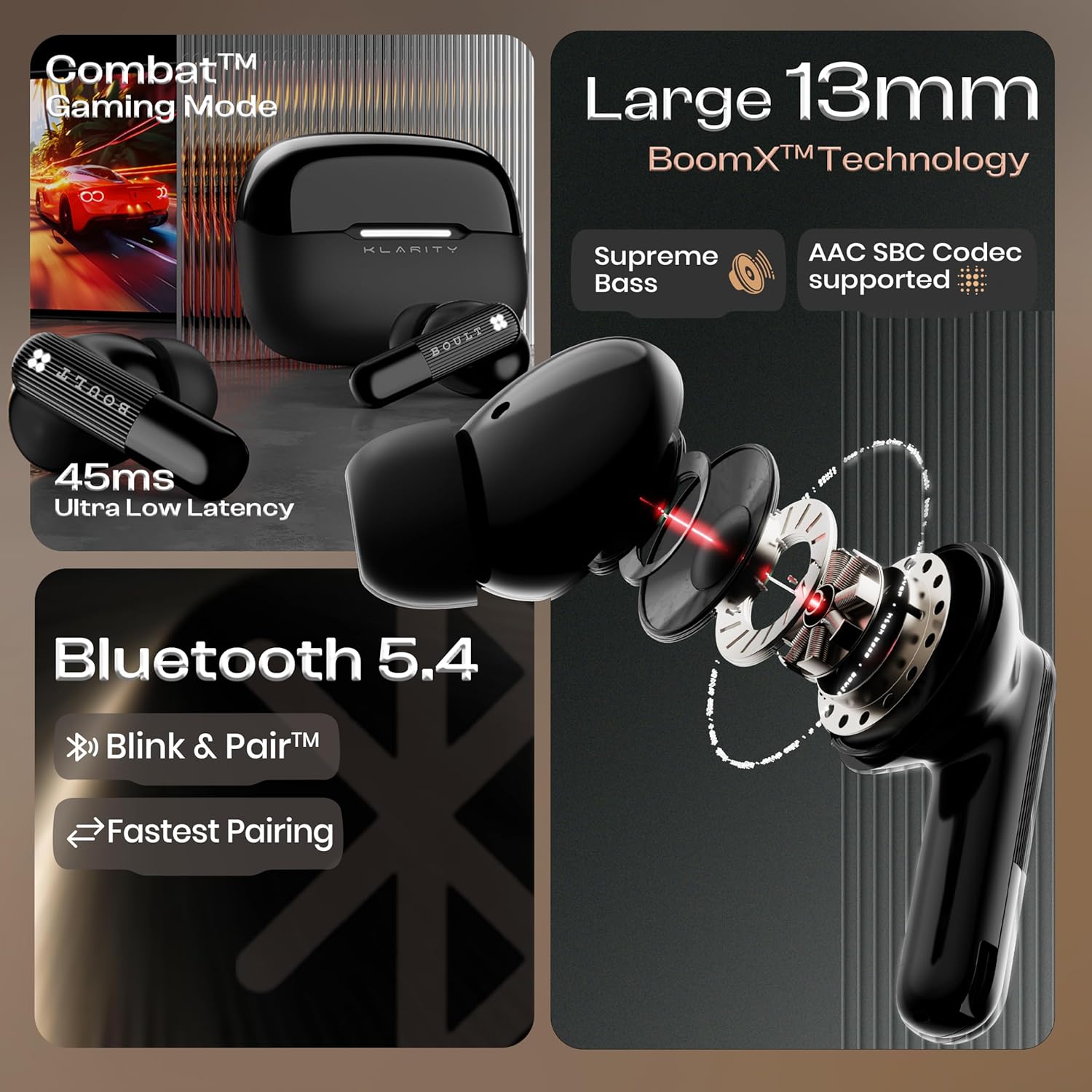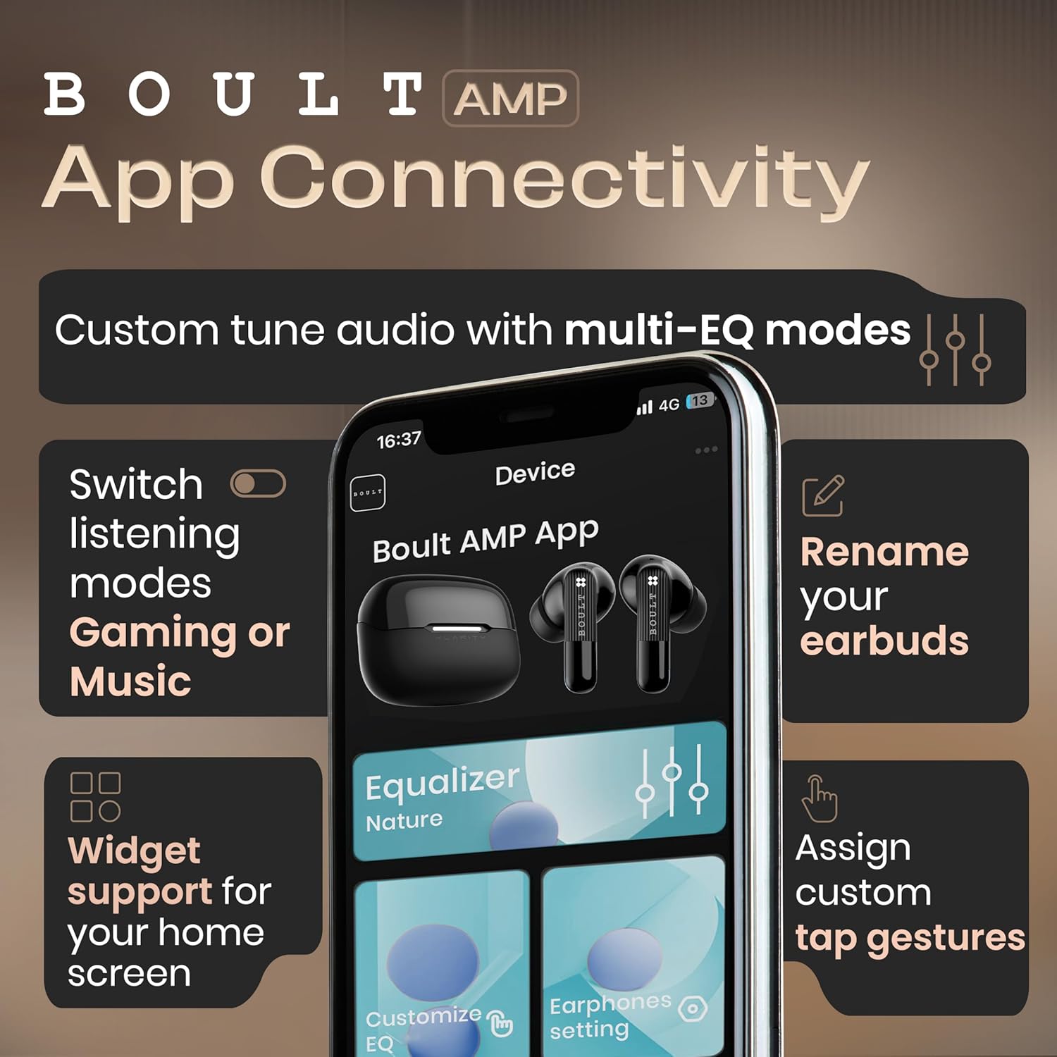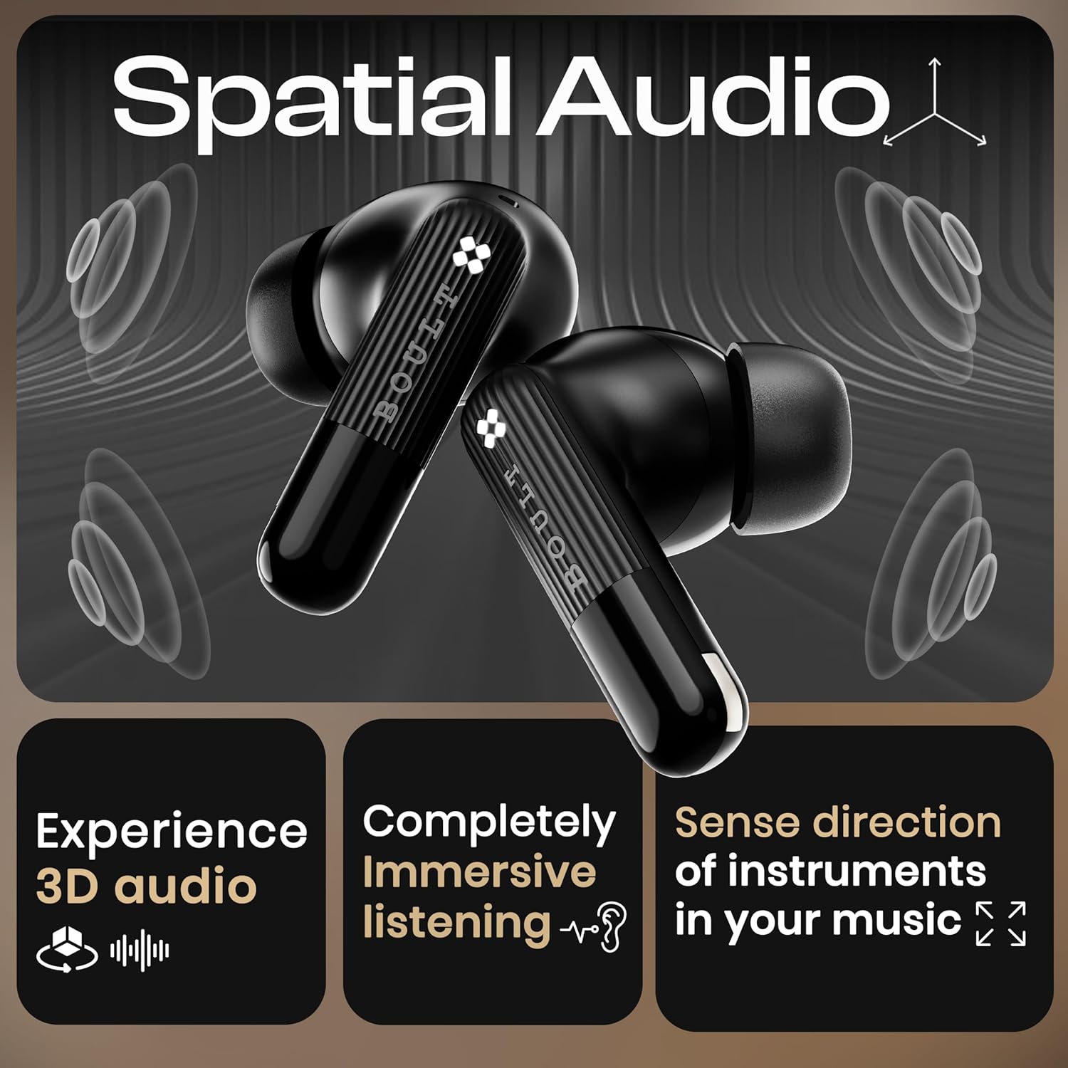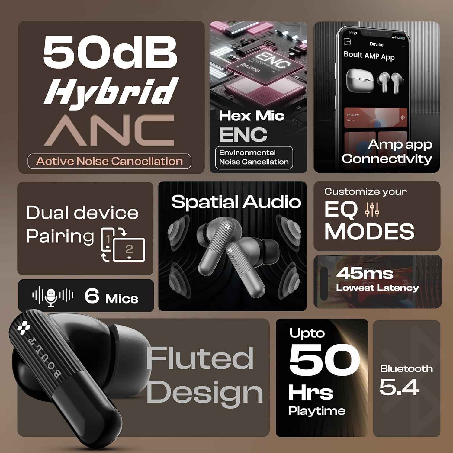 Fit and finish, 6 Mic Hybrid ANC, Bluetooth 5.4, Spatial Audio, 50H Playtime, Hex Mic ENC, App Connectivity, 13mm Bass Drivers, Dual Device Pairing, Touch Controls, Multipoint Pairing |